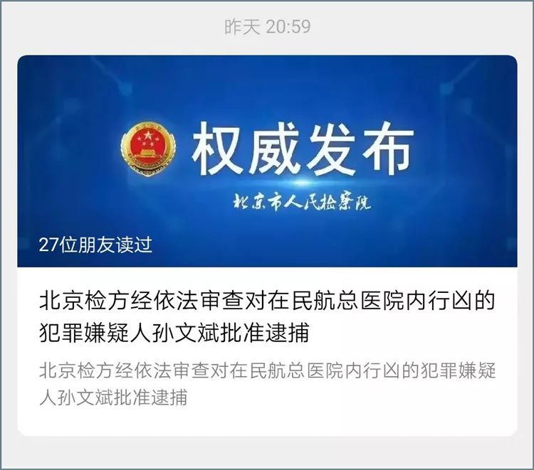 据京检在线音讯,12月27日,北京市检察院第三分院经依法检查,对在北京市朝阳区民航总医院急诊科抢救室内行凶的嫌疑犯孙文斌,以涉嫌成心杀人罪批准逮捕。