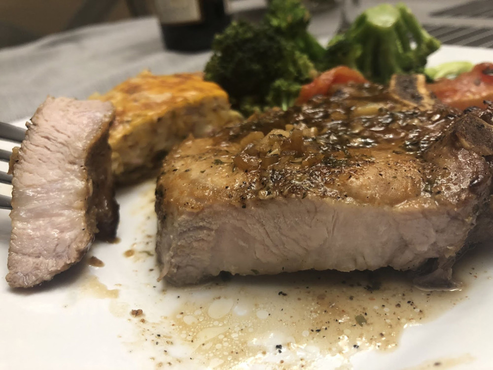 带着汤汁一同烤的猪排比较多汁,略微烤过头也不需要过多的忧虑。