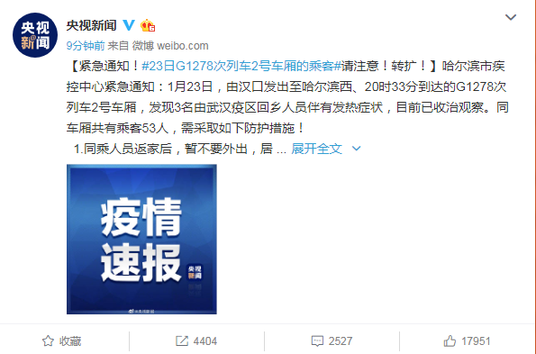 哈尔滨市疾控中心紧急通知:1月23日,由汉口宣布至哈尔滨西、20时33分抵达的G1278次列车2号车厢,发现3名由武汉疫区回乡人员伴有发热症状,现在已收治调查。同车厢共有乘客53人,需采纳如下防护办法!