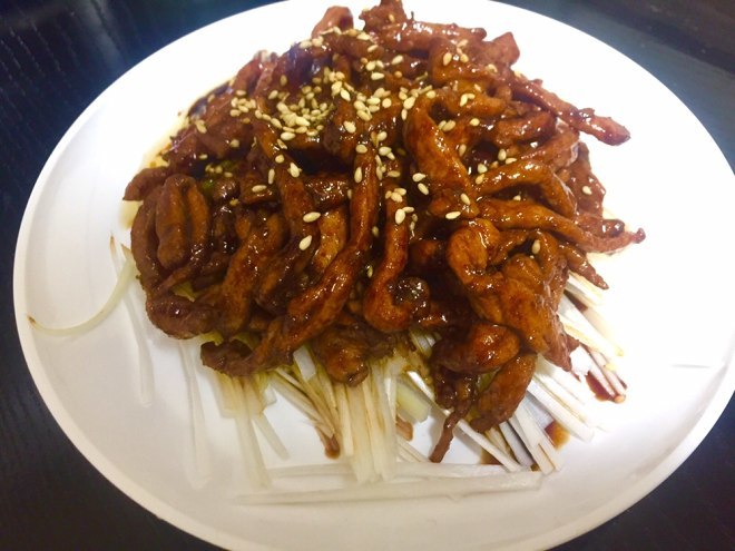 小贴士:关于葱丝有人不喜欢太辛辣的话,切完丝后能够放水浸泡2分钟。此菜吃的是甜口,故糖要多放,具体量依据个人口味。