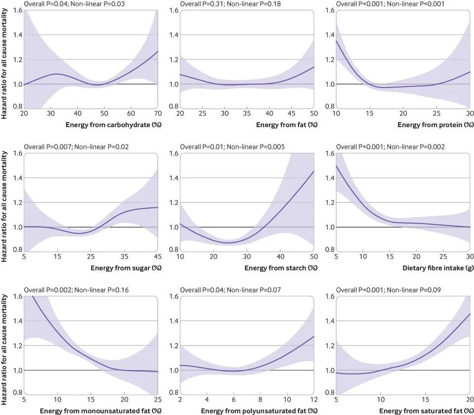 经过对这些参与者的数据做多元化的剖析,研讨人员发现碳水化合物(糖、淀粉和纤维)和蛋白质的摄入与全因逝世率呈非线性联系,而脂肪则与全因逝世率呈线性相关。其间,较高的糖分摄入与全因逝世危险和患心血管疾病的危险较高均有相关,而较高的饱满脂肪酸摄入与全因逝世危险较高有关。