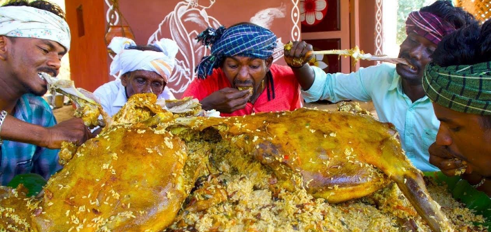 在印度乡村的土豪家庭,每隔一段时间他们都会做羊肉焖饭来吃,弄回来几只羊,足足有50斤重,印度人首要将它们放入大锅中,用各种调料先煮一遍入味,然后印度人将羊肉捞起来,持续放入调料更多的大锅中,并将10多斤的大米全倒进去,焖上两个小时就能吃了!