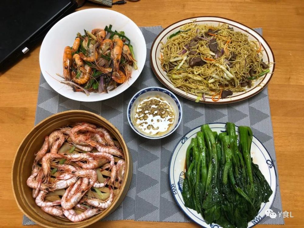 姜葱炒虾、蒸虾、牛肉炒面、白灼菜心